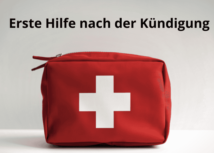 Ein roter Erste-Hilfe-Kasten mit einem weißen Kreuz steht auf einer hellen Fläche. Darüber steht in deutscher Sprache der Text "Erste Hilfe nach der Kündigung".